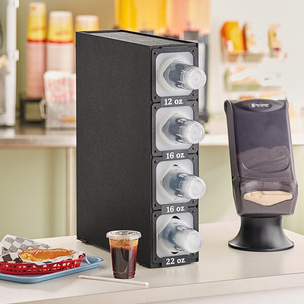 This 4 slot organizer is an all-in-one, space-saving solution for organizing cups at self-service stations or for back-of-house takeout preparation. It dispenses one cup at a time to help eliminate waste and save money at your establishment. This organizer's classic black color helps conceal signs of wear and allows it to seamlessly complement your existing decor. It comes with ounces and straws decals to keep your supplies clearly labeled. This unit is a practical addition to any self-service station.