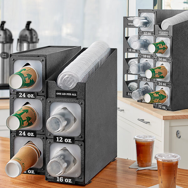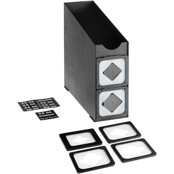 This 2 slot organizer is an all-in-one, space-saving solution for organizing cups, lids, and straws for easy access at self-service stations or for back-of-house takeout preparation. It dispenses one cup at a time to help eliminate waste and save money at your establishment. This organizer's classic black color helps conceal signs of wear and allows it to seamlessly complement your existing decor. It comes with ounces and straws decals to keep your supplies clearly labeled. This unit is a practical addition to any self-service station.
