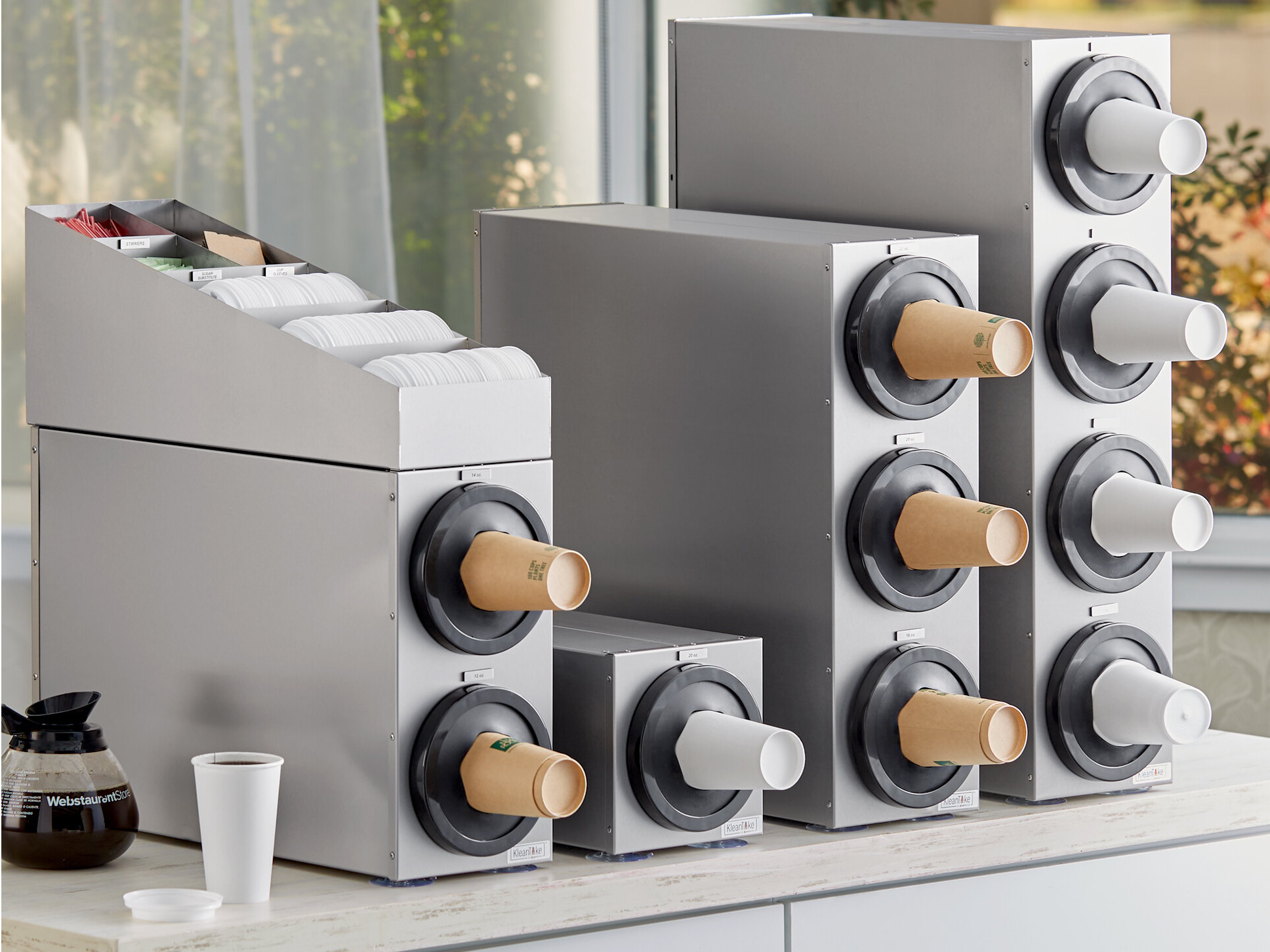 - Dispenses 8-44 oz. cups (sold separately)