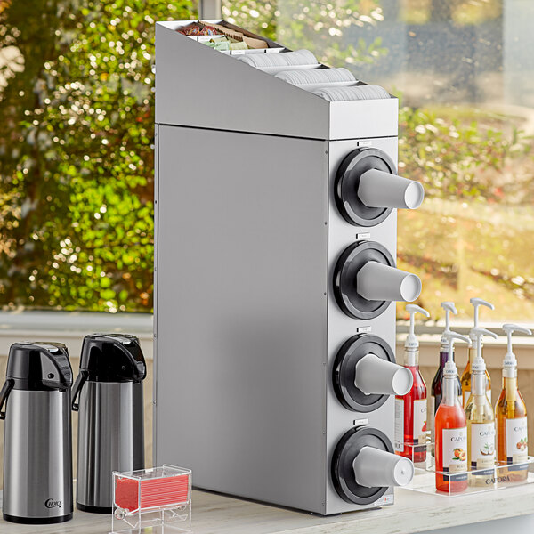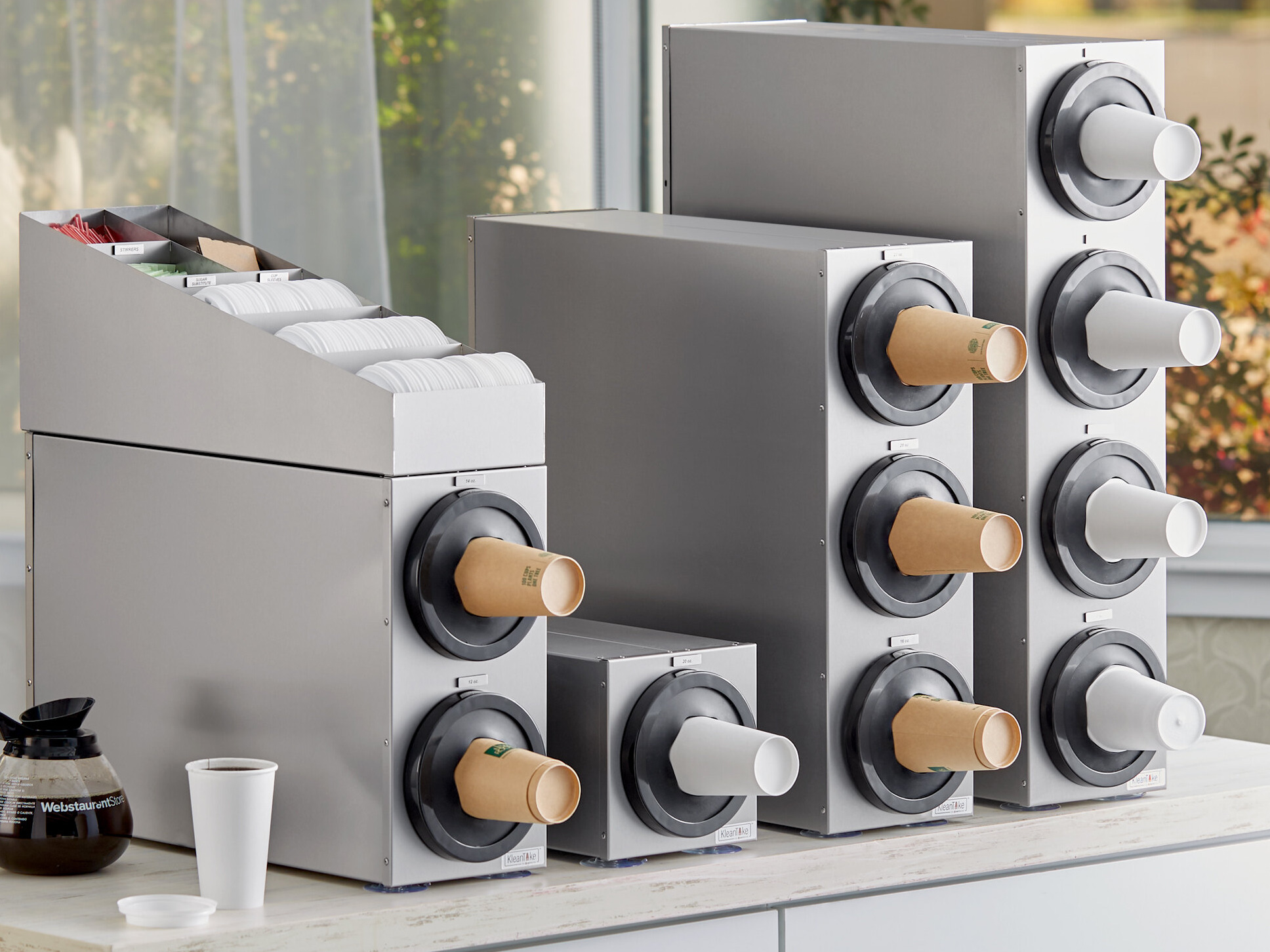 This 4-slot dispenser helps keep cups fully contained, reducing the risk of contamination and maintaining a sanitary and organized beverage station. Each slot dispenses one cup at a time, helping to eliminate waste and save money compared to traditional cup organizers where cups can be taken in excess and scattered or dropped on the floor. A top organizer attaches securely to the cabinet via screws and holes on both the top and back, ensuring stability and durability. This dispenser is an ideal choice for busy cafes, convenience stores, and other foodservice establishments looking to streamline their operations.