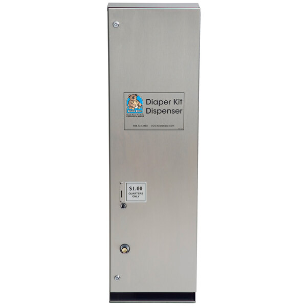 Provide your guests with easy access to a diaper when an accident happens with the Koala Kare KB143-SS diaper kit dispenser! It holds up to 24 Koala Kare diaper kits, and could be the difference that keeps your customers from having to leave suddenly. This diaper vending machine features sturdy 18-gauge type 304 stainless steel construction. It comes set to vend at one dollar, and features multiple coin settings for US and Canada.