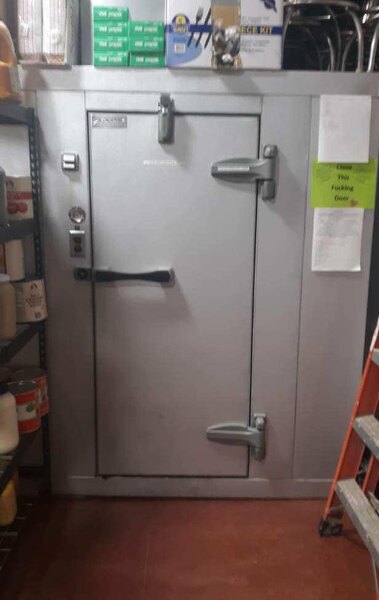 Workers can easily access the cooler's contents through the 26" wide door that boasts adjustable spring loaded hinges and a durable, ergonomic handle. The door has integrated heater for added protection against condensation, while a safety release is also included inside the unit to prevent accidental entrapment. A 2 1/2" dial thermometer is mounted on the cooler's exterior for simple temperature monitoring, while the interior is illuminated by a vapor-proof interior light for easy product identification. A 115V electrical connection is required for operation.