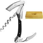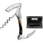 The perfect choice for a sommelier, this one-of-a-kind luxury corkscrew delivers excellent performance and a stand-out appearance to differentiate the wine service in your wine bar or fine dining restaurant. This corkscrew's smooth, rounded boot lever opens bottles with ease. To use, start by cutting the foil under the lip of the bottle using the forged knife blade. Remove the foil and retract the knife. Then insert the worm into the cork and turn to secure the corkscrew. Place the notch of the boot lever on the lip of the bottle, hold it in place, and lever the handle to pull the cork out of the bottle.