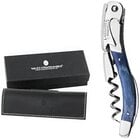 The perfect choice for a sommelier, this one-of-a-kind corkscrew delivers excellent performance and a classy appearance to elevate wine service in a wine bar or fine dining restaurant. This corkscrew's smooth, rounded boot lever and two-step design opens bottles with ease and minimizes messes. To use, start by cutting the foil under the lip of the bottle using the knife blade. Remove the foil and retract the knife. Then insert the worm into the cork and turn to secure the corkscrew. Place the first notch of the stainless steel boot lever on the lip of the bottle, hold it in place, and lever the handle to pull the cork about halfway out of the bottle. Move the second notch of the boot lever to the lip of the bottle and pull the cork the remainder of the way out.