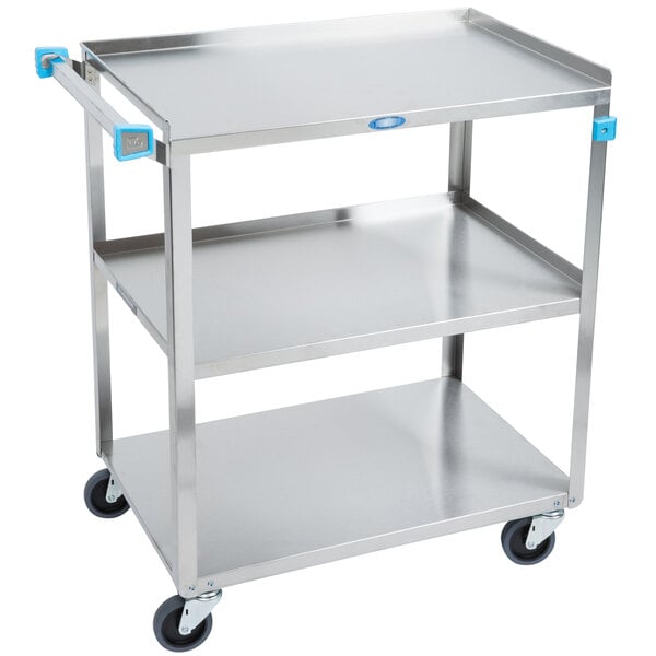 Your facility is a busy place! This Lakeside cart will make it easy to move supplies from one room to another, supported by 1 of 3 sturdy shelves and gliding on smooth, swivel casters. It even offers a stellar 300 lb. weight capacity to handle a wide variety of tasks, from lugging bus bins to the warewashing area to rolling dry bulk ingredients from the stock room to the prep area. However you use this utility cart, it's sure to increase the convenience and ergonomics of your operation.