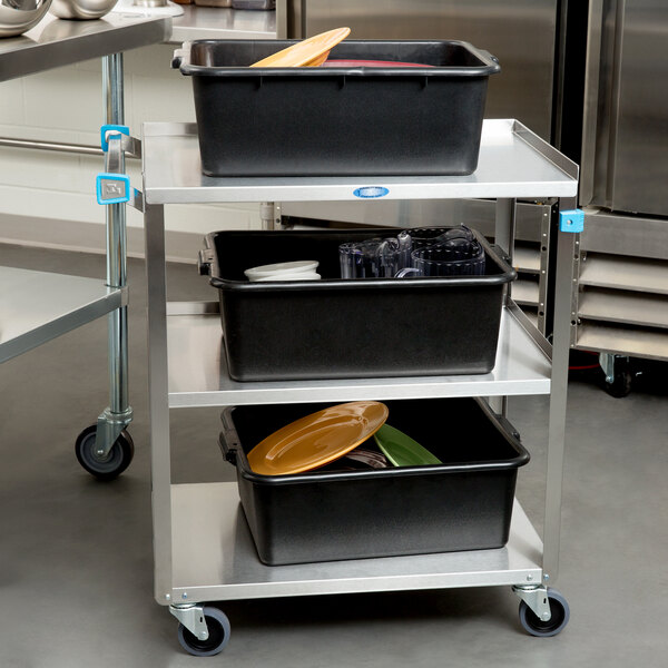Safely transport bus tubs and supplies between the kitchen and the front of the house with the contemporary Lakeside 322 standard duty stainless steel three shelf utility cart.