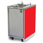 Allowing you to meet local health code requirements, this hand sink cart features an attractive beige suede laminate finish as well as a chrome-plated hot water faucet and soap dispenser. Its locking door keeps the water tanks, pump equipment, and water heater secure. Thanks to its 5" non-marking cushion tread casters (2 fixed, 2 swivel with brake), this cart is easy to maneuver. It requires a 120V, 2000W electrical connection.