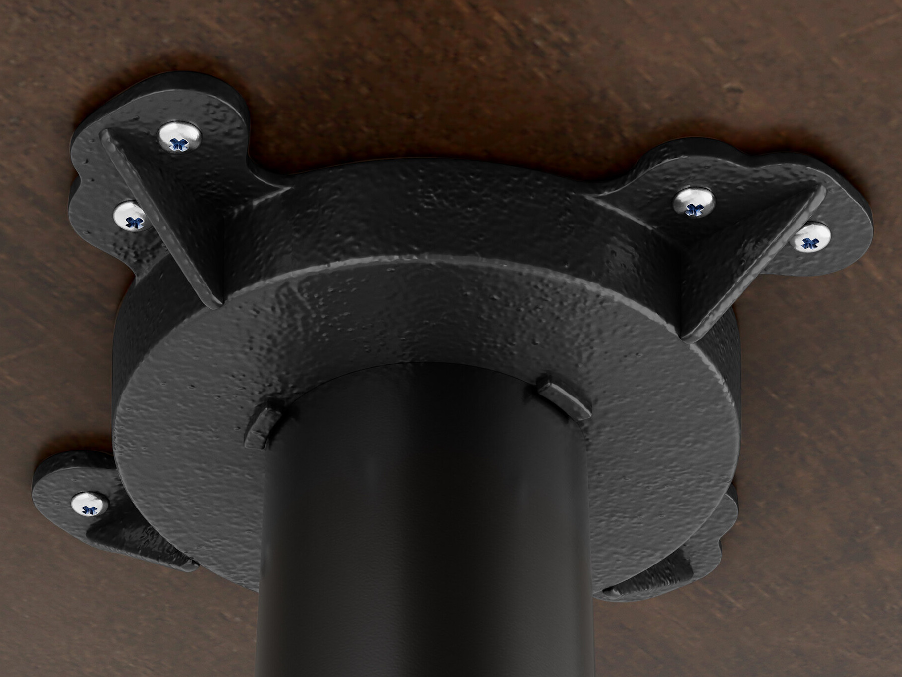 A steel column and rod extends the table top to bar height and is connected to the table top via a black, powder-coated 10" spider attachment that resists damage.