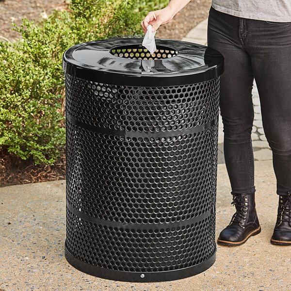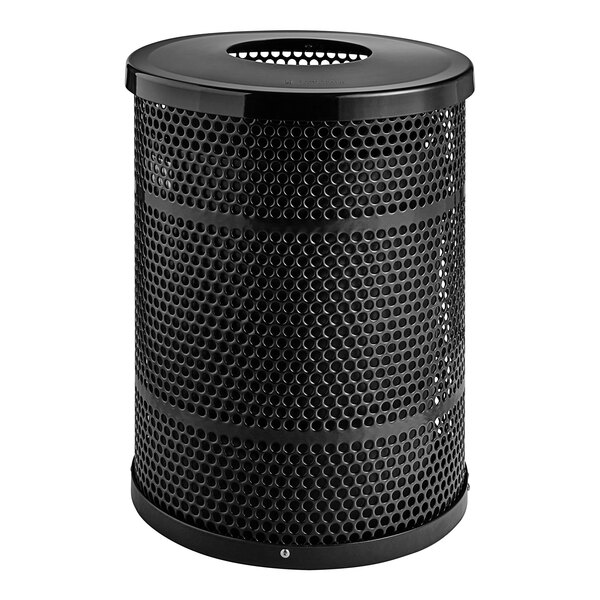 Lancaster Table & Seating 32 Gallon Heavy-Duty Round Black Steel Perforated Outdoor Trash Can with Flat Lid