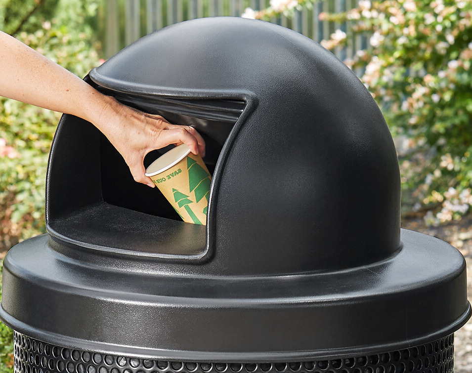 Crafted from durable, thermoplastic perforated steel and a sturdy steel base, this 55 gallon can is built to withstand heavy use in outdoor environments. The included rigid plastic liner ensures easy waste disposal and maintenance, while the covered dome lid keeps trash concealed and helps prevent odors from escaping. Ideal for parks, municipalities, and schools, this heavy-duty trash can is designed to withstand the rigors of outdoor use and maintain a clean, organized appearance.