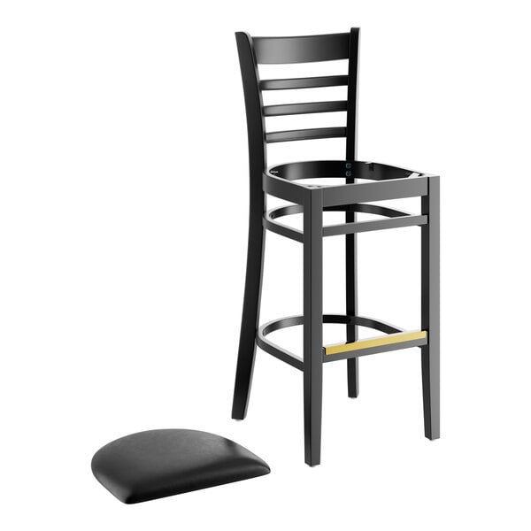 Lancaster Table & Seating Black Finish Wood Ladder Back Bar Stool with Black Vinyl Seat Cushion - Detached Seat