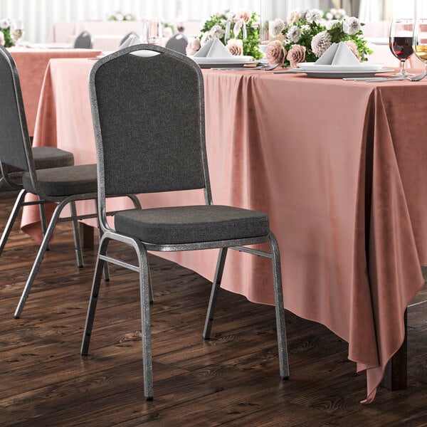 Enhance your next event with the Lancaster Table & Seating gray fabric crown back stackable banquet chair with silver vein frame! With a crown back design, this chair supports guests through events like weddings, award ceremonies, and church gatherings. Framed in silver and covered in a gray fabric, this chair is sleek and stylish. Guests will appreciate the comfort provided by the padded back and 2" thick foam seat made with fire-retardant CAL 117 foam. Designed with versatility in mind, this chair will save you money and space by seamlessly transitioning between events. Regardless of the event you are hosting, you can depend on this chair!