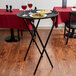 Lancaster Table & Seating's 36" black metal tray stand is an affordable and high-quality choice for any restaurant, pizzeria, bar, catered event, or hotel. Its convenient height makes tableside service a breeze and helps servers deliver food in a timely and efficient manner. The sleek edges and streamlined design are aesthetically pleasing, and a black metal powder coated finish works well with any businesses' decor. Tray stands are also a useful option for busers on busy nights where no adjacent tables are available for their bus tub.