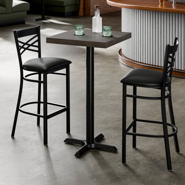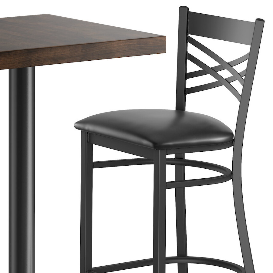 The two, sturdy black bar stools provide a comfortable, yet functional place to enjoy the time spent in your busy establishment. With an eye-catching, cross-back design, they are specially contoured for a customer’s back, allowing ultimate relaxation while dining. A 2 1/2” padded vinyl seat filled with CA117 fire-retardant foam not only bolsters the comfort of these bar stools, but also contributes to the overall safety of your guests. Furthermore, the lightweight, 18-lb. design and included guides mean they are easy to move without worrying about scratched, scuffed floors.