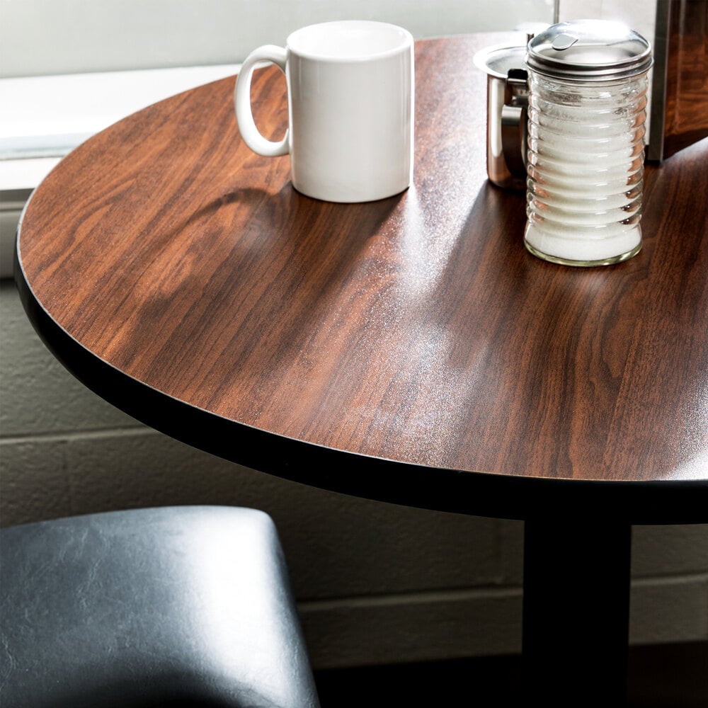 The Lancaster Table & Seating 30” round table top is the versatile choice for your restaurant, cafeteria, or ice cream shop. Thanks to the reversible walnut and oak design, you can easily pick the side that best matches the color scheme or decor of your business. This product is also crafted from smooth laminate materials that make it easy to wipe clean.