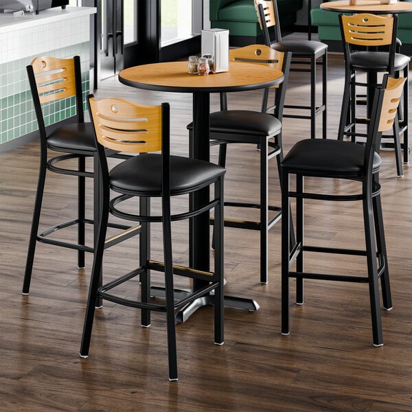 Seat your guests in comfort and style with this Lancaster Table & Seating black finish bar stool with 2 1/2" red vinyl padded seat and mahogany wood back. This bar stool's stylish back and padded seat combine with its modern steel frame to instill a unique look in any location. Plus, since this bar stool's back is contoured for a customer's back, it will provide comfort while maintaining a distinct appearance.