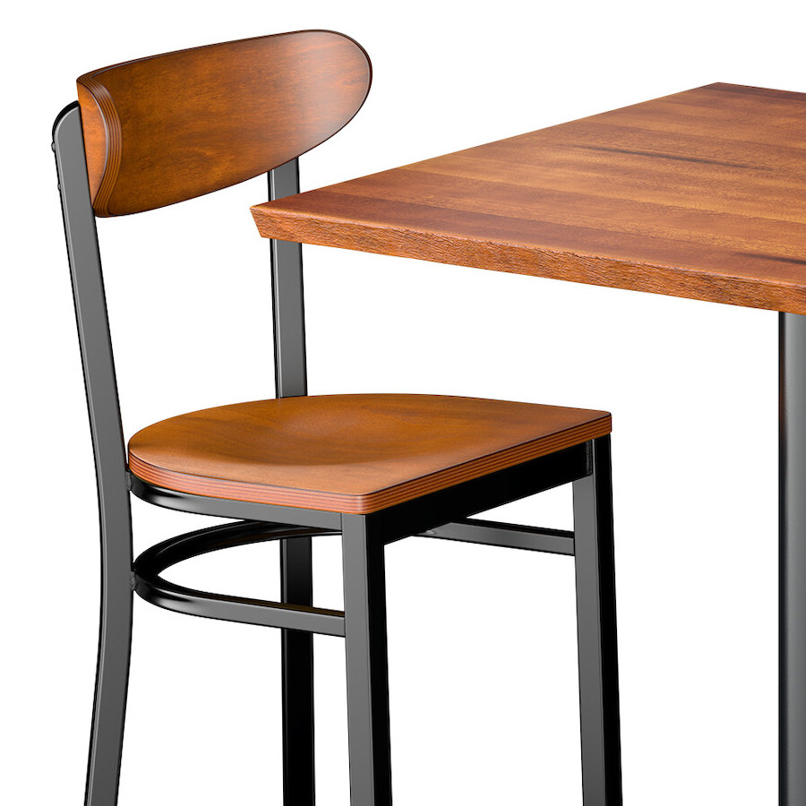 Complementing the rustic table are two Lancaster Table & Seating Boomerang dining height chairs with rustic walnut seats and backs. Each chair has a contemporary black steel frame along with a comfortable rustic walnut seat and back. Plus, since the chairs' backs are contoured for a customer's back, they will provide unmatched comfort while maintaining a distinct appearance. The chairs are designed with integrated glides to protect your floors from scuffing. At the same time, the black powder coat on the chairs ensures longevity even through everyday wear and tear, resisting stains, scratches, and smudges.