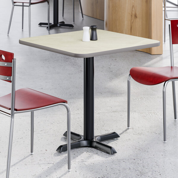 Take the guess-work out of selecting compatible table tops and bases with this 30" x 30" reversible gray / white table top and cross base plate! This table gives your establishment a modern look and provides your guests a stable place to comfortably enjoy their drinks and food! From the strong, sturdy cast iron base plate and spider, to the sleek black column and durable laminated table top, this table is an all-in-one addition to any establishment. Plus, with a contemporary square shape, it's sure to add aesthetic appeal to any establishment. The compact 30" x 30" design comfortably seats 2 to 4 guests without taking up too much room, making it the perfect choice for any restaurant, pizza shop, or cafeteria!