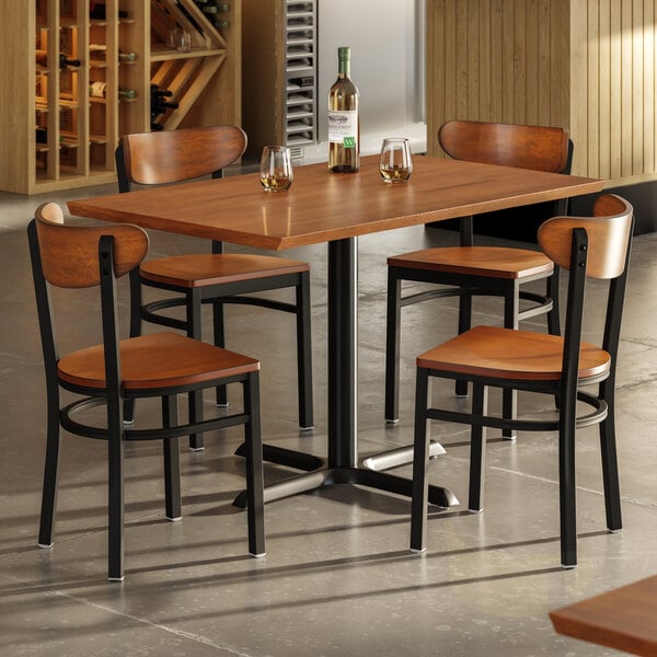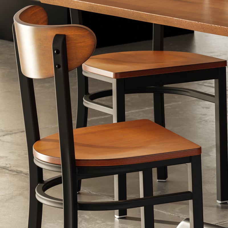 Complementing the rustic table are four Lancaster Table & Seating Boomerang dining height chairs with rustic walnut seats and backs. Each chair has a contemporary black steel frame along with a comfortable rustic walnut seat and back. Plus, since the chairs' backs are contoured for a customer's back, they will provide unmatched comfort while maintaining a distinct appearance. The chairs are designed with integrated glides to protect your floors from scuffing. At the same time, the black powder coat on the chairs ensures longevity even through everyday wear and tear, resisting stains, scratches, and smudges.