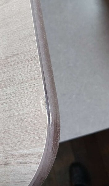 Recieved my order from FedEx, box was torn / dented in several places. Upon inspection discovered what appeared to be a manufacturing defect. Edge of table had a chipped place, this must have happened at factory because it had been puttied to touch it up. And it also had been dropped on one of the corners, edging was marred and laminate was chipped. They did send a replacement! When I received the 2nd top, it had the same Mfg. defect I discribed. And a corner was damage on it also