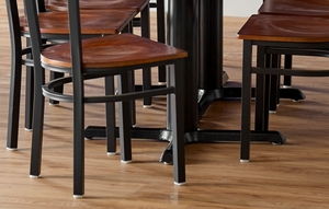 Complementing the rustic table are eight Lancaster Table & Seating Boomerang dining height chairs with rustic walnut seats and backs. Each chair has a contemporary black steel frame along with a comfortable rustic walnut seat and back. Plus, since the chairs' backs are contoured for a customer's back, they will provide unmatched comfort while maintaining a distinct appearance. The chairs are designed with integrated glides to protect your floors from scuffing. At the same time, the black powder coat on the chairs ensures longevity even through everyday wear and tear, resisting stains, scratches, and smudges.
