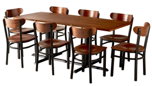 Coming with an attractive table top, compatible dining height base, and 8 matching Boomerang brand chairs, this set provides you with everything you need to set up and complete the look of your dining area. It's sure to add a rustic element with contemporary flair to your restaurant, bistro, or bar!