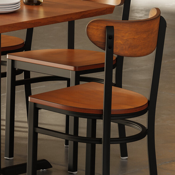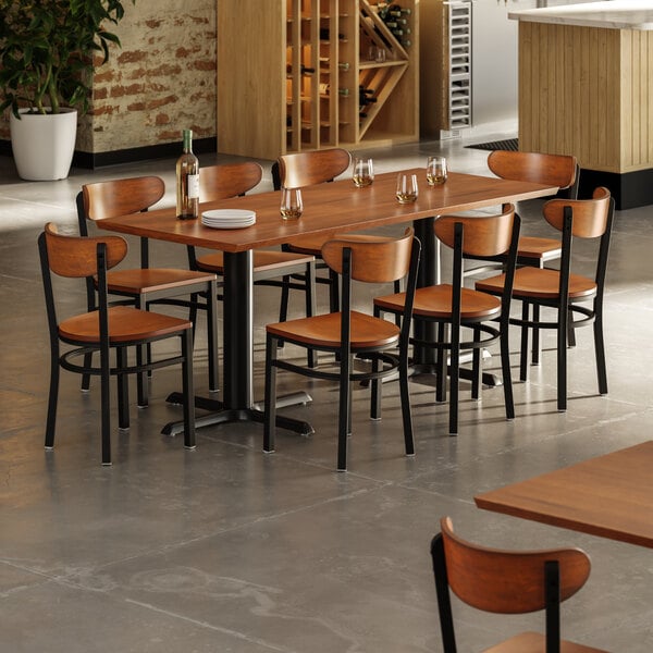 Complementing the rustic table are eight Lancaster Table & Seating Boomerang dining height chairs with rustic walnut seats and backs. Each chair has a contemporary black steel frame along with a comfortable rustic walnut seat and back. Plus, since the chairs' backs are contoured for a customer's back, they will provide unmatched comfort while maintaining a distinct appearance. The chairs are designed with integrated glides to protect your floors from scuffing. At the same time, the black powder coat on the chairs ensures longevity even through everyday wear and tear, resisting stains, scratches, and smudges.