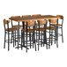 Complementing the rustic table are eight Lancaster Table & Seating Boomerang bar height chairs with vintage wood seats and backs. Each chair has a contemporary black steel frame along with a comfortable vintage wood seat and back. The Boomerang design is both sturdy and stylish, instilling a modern look in any location. Plus, since the chairs' backs are contoured for a customer's back, they will provide unmatched comfort while maintaining a distinct appearance. This reliable and modern design ensures you'll be using these bar height chairs in your pub or restaurant for years to come.
