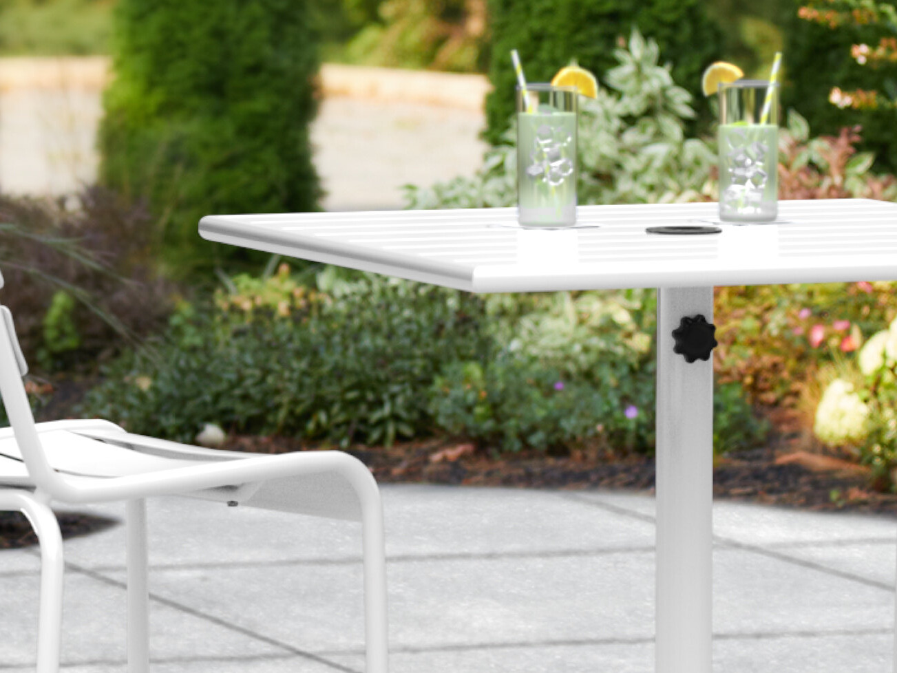 This table is made of powder-coated aluminum that's durable enough to resist weather and corrosion. Its smooth surface features a neutral white color that's sure to match your decor and complement the summer skies and clouds!
