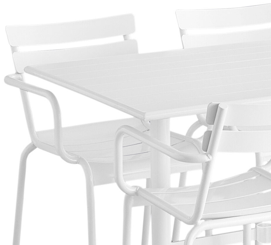 The smooth surfaces of the table and chairs feature a white color that's sure to induce a lively atmosphere and complement the warm summer sky. Thanks to its UV-resistant finish, the color won't fade over time when left in the sun for longer periods.