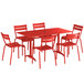 Allow your guests to enjoy the breezy summer weather with this Lancaster Table & Seating 32" x 60" red powder-coated aluminum dining height outdoor table with umbrella hole and 6 side chairs