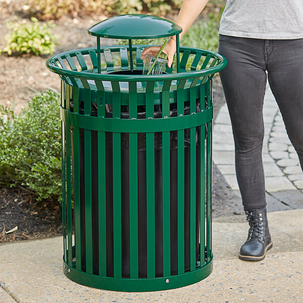 Lancaster Table & Seating 36 Gallon Heavy-Duty Round Green Steel Slatted Outdoor Trash Can with Rain Bonnet Lid