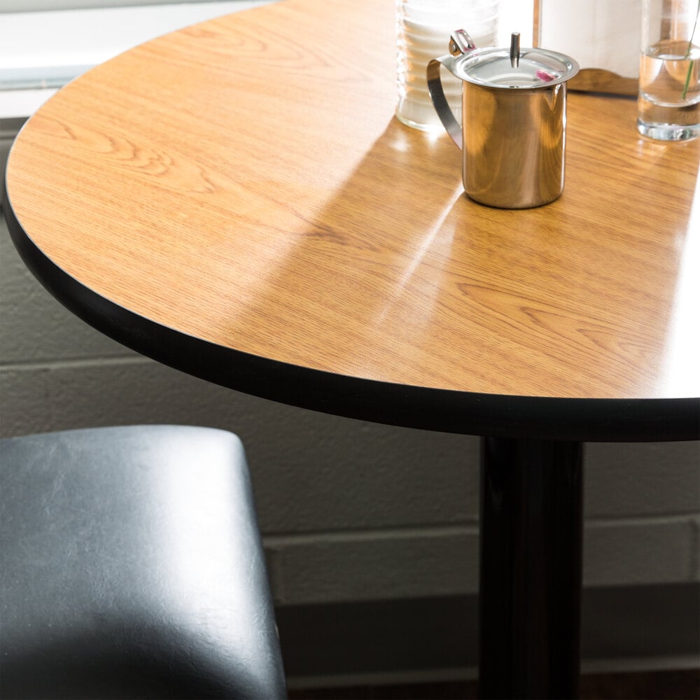 Lancaster Table & Seating's laminate round reversible table top is durable, high quality, and perfect for any restaurant. One side of this table has a walnut look finish and the other an oak look finish to maximize versatility and allow you to match your business' decor. This table top measures 36" in diameter and is 1 1/8" thick. Plus, it has black vinyl molding on its edges to protect against scuffing and chipping. This table top can also be used in bars, pizzerias, bistros, buffets, or banquets.