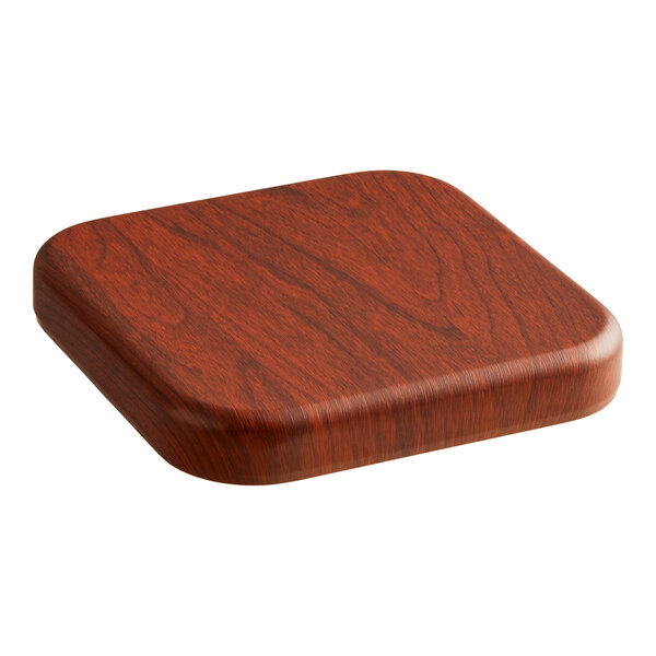The square design and 8" x 8" size are perfect for use as a sample product. This tabletop also sports a red mahogany finish that complements any setting. The rounded edges and corners look great and provide added safety for children. This tabletop is meant for indoor use only. It is the perfect addition to your commercial establishment.