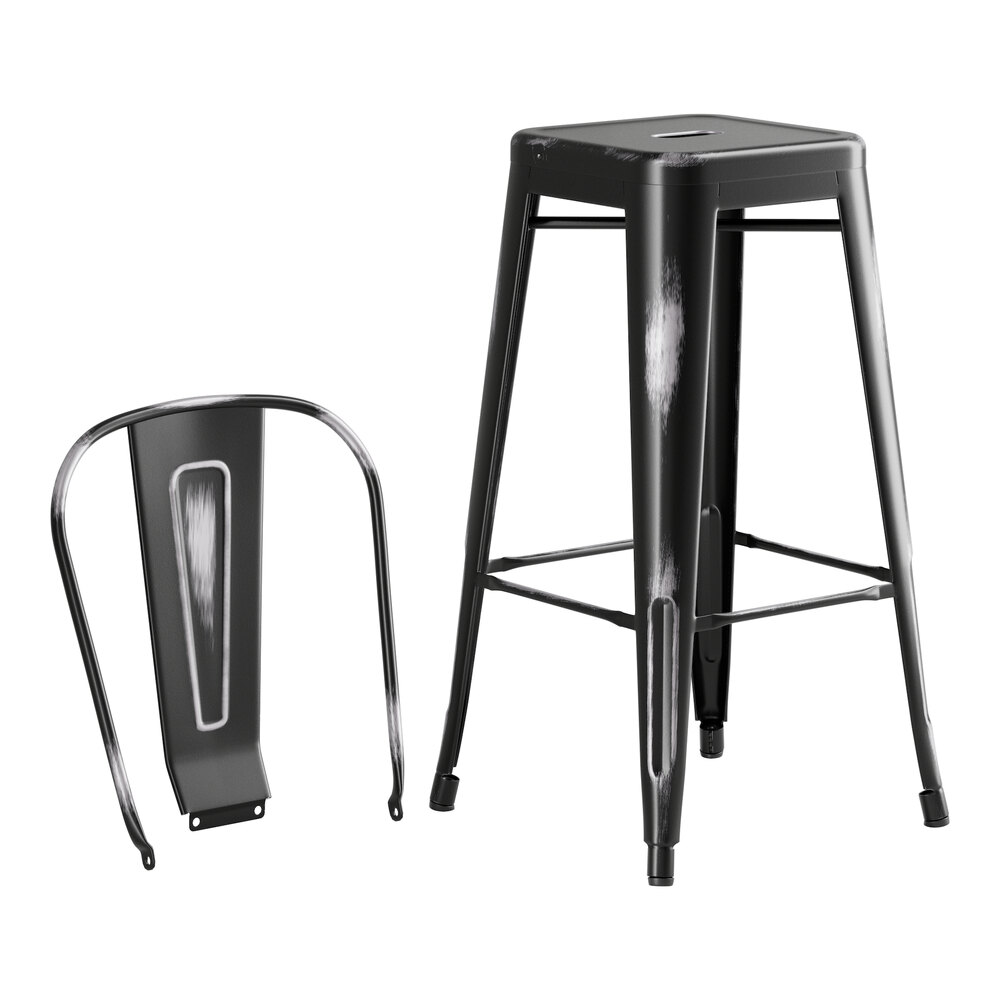This set is made of durable steel and coated to withstand years of use. The distressed onyx-black color adds a sleek, modern touch to any setting and is sure to be a contemporary design choice that guests love. Comfortable and stylish, this strong yet lightweight set is an excellent choice for your indoor or outdoor dining area. To save you money on shipping costs, the table ships unassembled and the stools ship with the backrests detached. All required assembly hardware is included so you can quickly set it up in its proper space and let your guests enjoy!