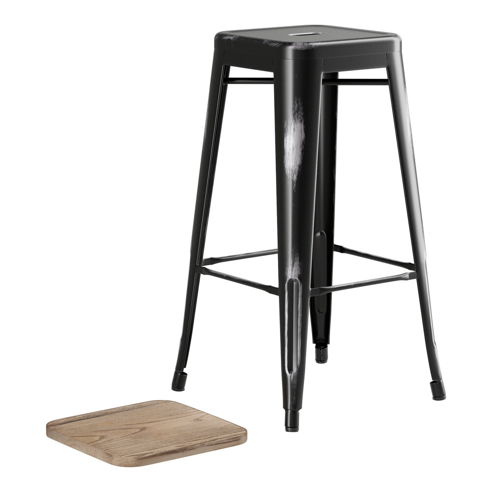 This stool is made of durable steel and coated to withstand years of use. The distressed onyx-black color adds a sleek, modern touch to any setting and is sure to be a contemporary design choice that guests love. Comfortable and stylish, this strong yet lightweight stool is an excellent choice for your indoor dining area. To save time and hassle, the barstool ships assembled. The seat ships detached from the stool.