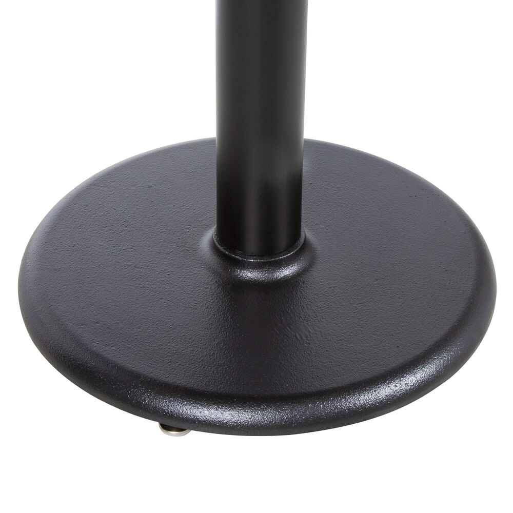 This table's eye-catching table top is accented and supported by the included table base. A 37 1/2" high black powder-coated steel column and rod extends the table top to bar height and is connected to the table top via a black, powder-coated 10" spider attachment. At the base of the table, a 17" round black, powder-coated base plate helps to prevent the table from wobbling, ensuring stability and balance. A 12-piece floor glide and screw hardware kit attaches to the base, further assisting in leveling the table while preventing the base from scratching the floor.