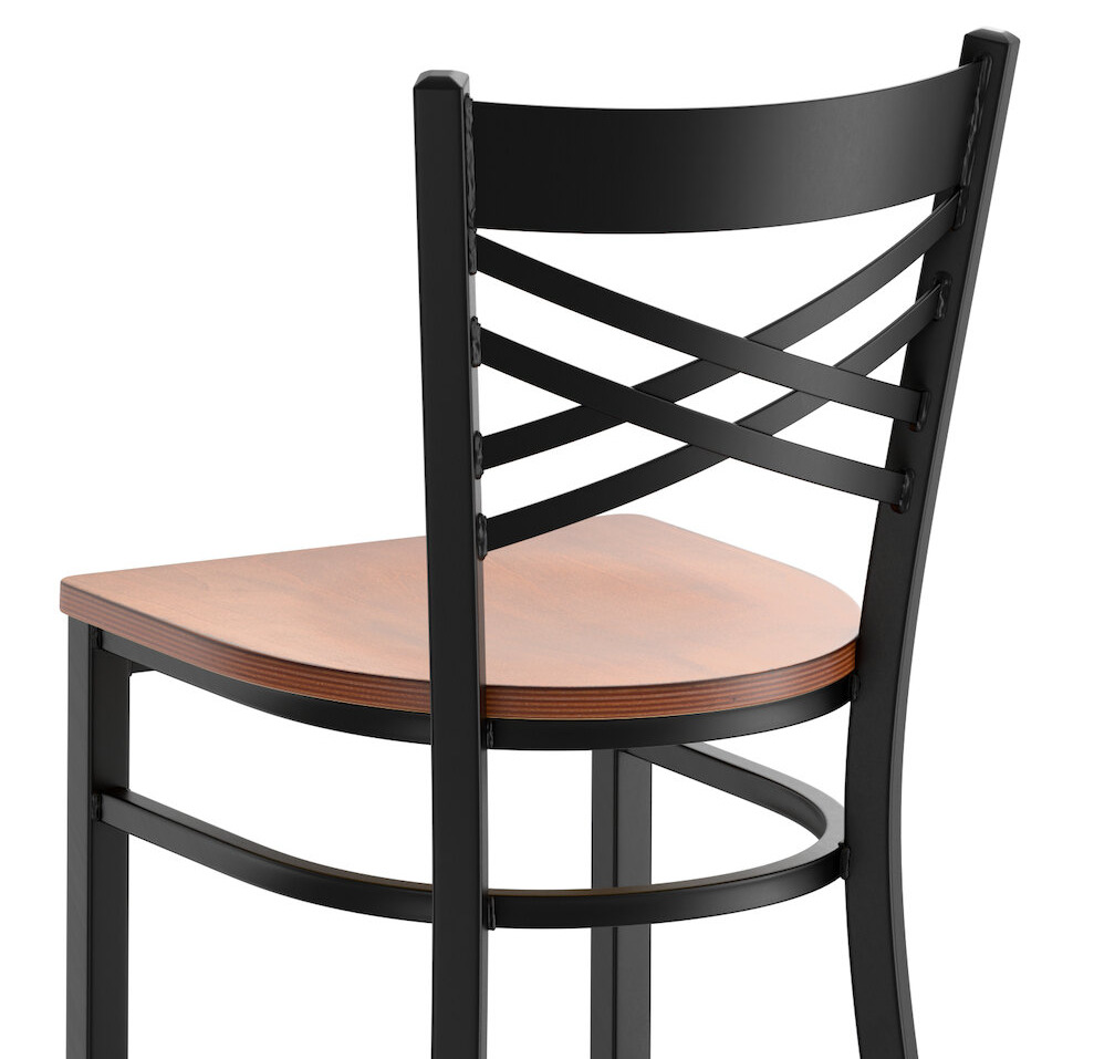 This bar stool's sturdy wood seat with a sleek antique walnut finish combines with its contemporary cross back steel frame to instill a modern look in any location. Plus, since this bar stool's back is contoured for a customer's back, it will provide comfort while maintaining a distinct appearance.