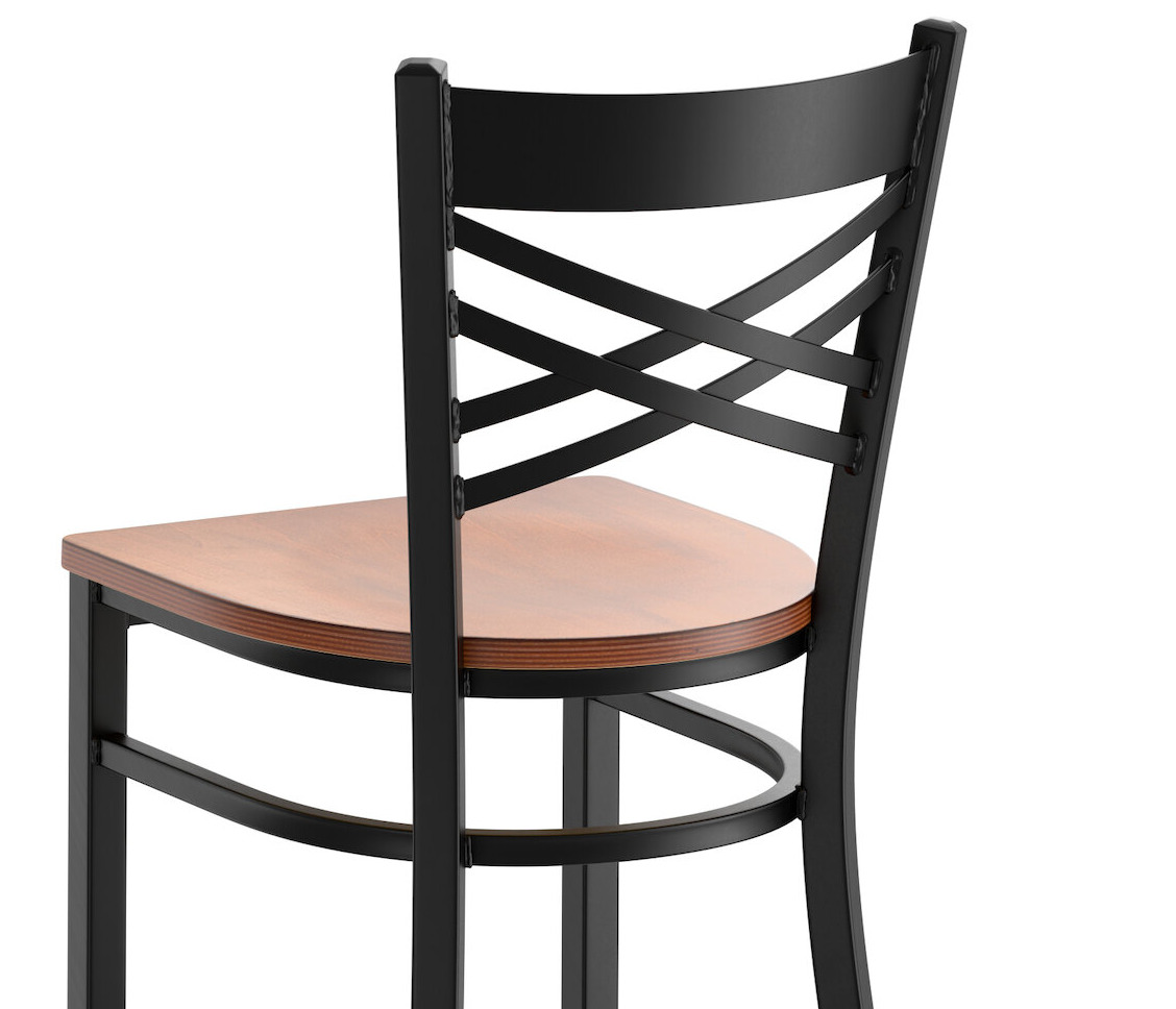 This bar stool's sturdy wood seat with a sleek antique walnut finish combines with its contemporary cross back steel frame to instill a modern look in any location. Plus, since this bar stool's back is contoured for a customer's back, it will provide comfort while maintaining a distinct appearance.
