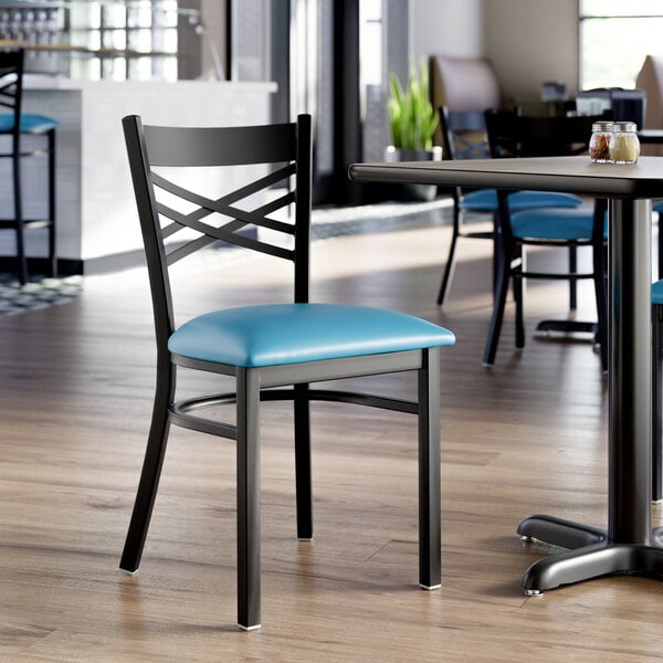 Seat your guests in comfort and style with this Lancaster Table & Seating black finish cross back chair with 2 1/2" blue vinyl padded seat.