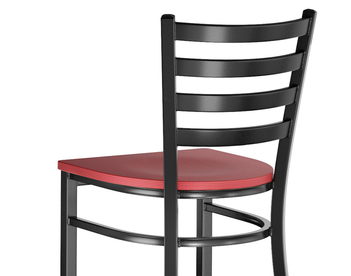 This bar stool's sturdy wood seat with a sleek mahogany finish combines with its contemporary ladder back steel frame to instill a modern look in any location. Plus, since this bar stool's back is contoured for a customer's back, it will provide comfort while maintaining a distinct appearance.