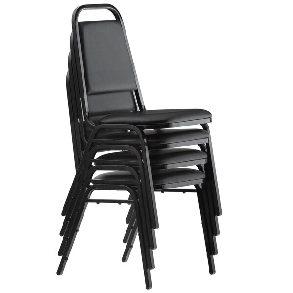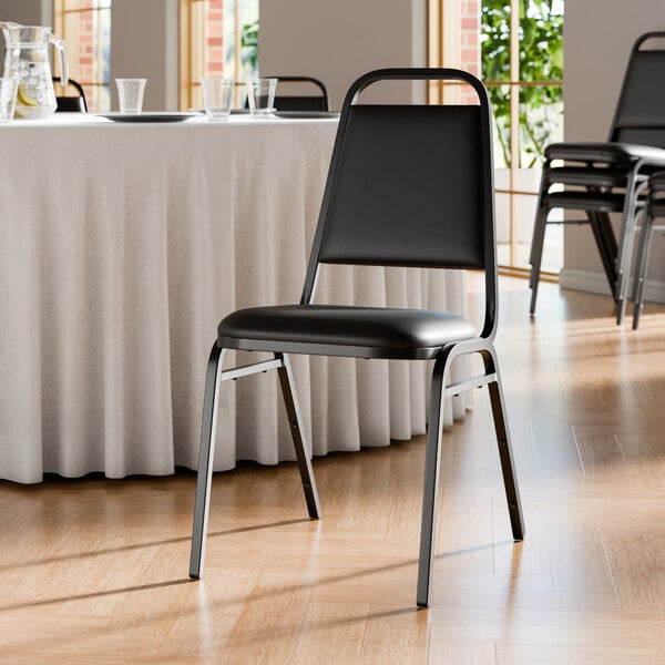 Perfect for banquet halls, meeting rooms, waiting rooms, and convention centers, the Lancaster Table & Seating black stackable banquet chair with 1” padded seat is what you need for your next event. This chair has a padded seat and back, ensuring your guests are comfortable through long ceremonies or presentations. It also features a neutral black color that can be used on its own or be fitted with a chair cover for a more formal look.