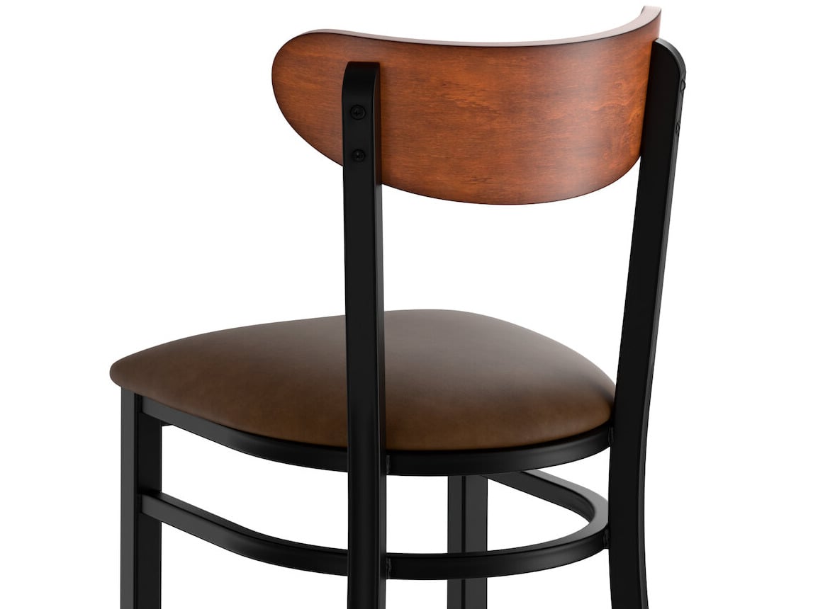 This bar stool's wooden Boomerang back and padded seat combine with its modern steel frame to instill a unique look in any location. Plus, since this bar stool's back is contoured for a customer's back, it will provide comfort while maintaining a distinct appearance.