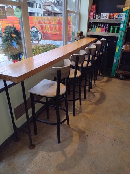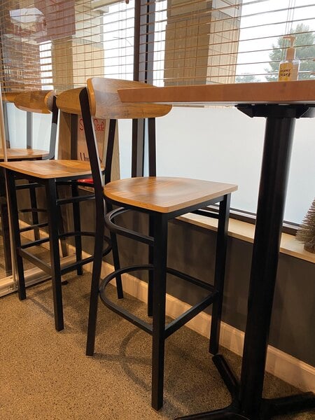 The bar stool's built-in footrest gives customers a place to rest their legs.