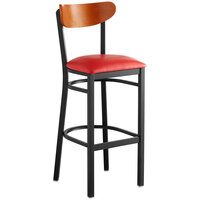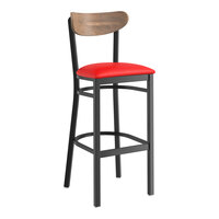 This bar stool's wooden Boomerang back and seat combines with its modern steel frame to instill a unique look in any location. Plus, since this bar stool's back is contoured for a customer's back, it will provide comfort while maintaining a distinct appearance.