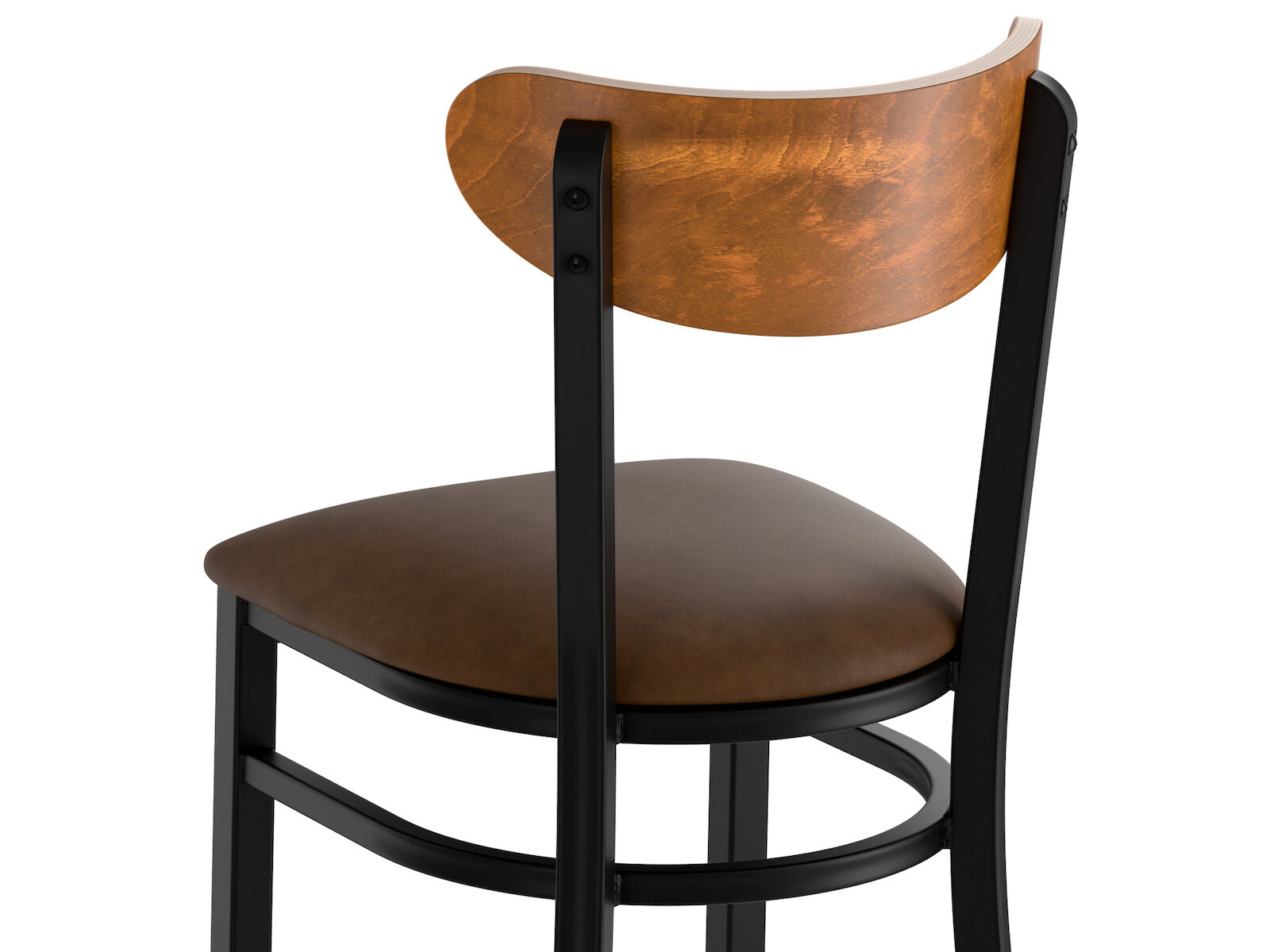 The back of the chair ( Boomerang) it quite comfortable and gives the chair a new modern, yet practical look. Affordable & sturdy. The padded cushion is comfortable, but be aware that after some time the screws do some loose and and the OSB like base doesn't allow for re-screwing/drilling. Our fix to this (as this was our second time purchasing this chairs) was to drill an anchor then insert the screw. (THIS IS ONLY our opinion of how to allow these chairs to last) Our first set of chairs at another location have been used for 6 years and still going strong without major wear and tear. Would buy a again