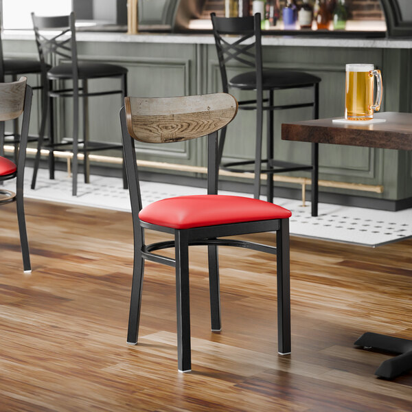 Seat your guests in comfort and style with this Lancaster Table & Seating Boomerang black finish chair with 2 1/2" red vinyl padded seat and driftwood back.