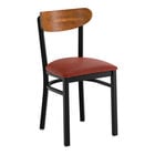 This chair's sturdy steel frame provides unmatched durability in your commercial dining room. It can hold up to 330 lb. of weight thanks to the steel frame and supports under the seat. Additionally, the black finish on this chair ensures longevity through everyday wear and tear, resisting stains, scratches, and smudges. It also features an attractive vintage wood back that's contoured to provide extra support to your customers' upper backs. The 2 1/2" thick blue vinyl padded seat brings exceptional comfort and durability while remaining easy to clean. It is made with fire-retardant foam for ultimate safety!