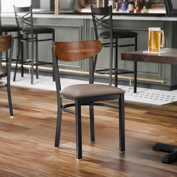 This chair's sturdy steel frame provides unmatched durability in your commercial dining room. It can hold up to 330 lb. of weight thanks to the steel frame and supports under the seat. Additionally, the black finish on this chair ensures longevity through everyday wear and tear, resisting stains, scratches, and smudges. It also features an attractive vintage wood back that's contoured to provide extra support to your customers' upper backs. The 2 1/2" thick taupe vinyl padded seat brings exceptional comfort and durability while remaining easy to clean. It is made with fire-retardant foam for ultimate safety!