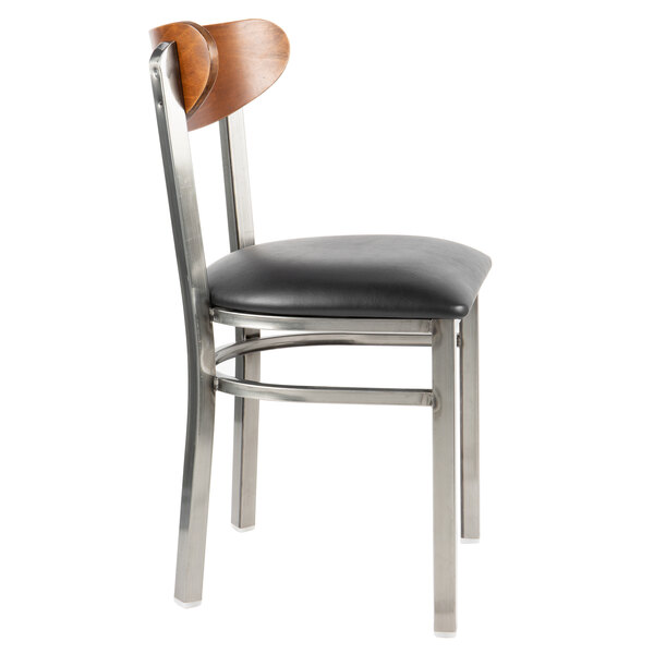 Seat your guests in comfort and style with this Lancaster Table & Seating Boomerang clear coat finish chair with 2 1/2" black vinyl padded seat and antique walnut wood back.